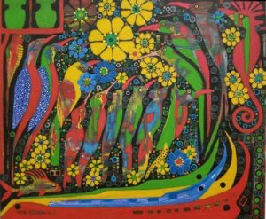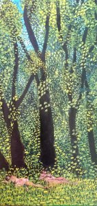 These paintings are from an earlier era of Mark Harris’ work, inspired by a trip to the Lassen Volcanic National Park in northeastern California. The serenity of these acrylic paintings are in direct contrast to his later series of powerful collages exposing racism and imperialism. Mark is a San Francisco-based artist.